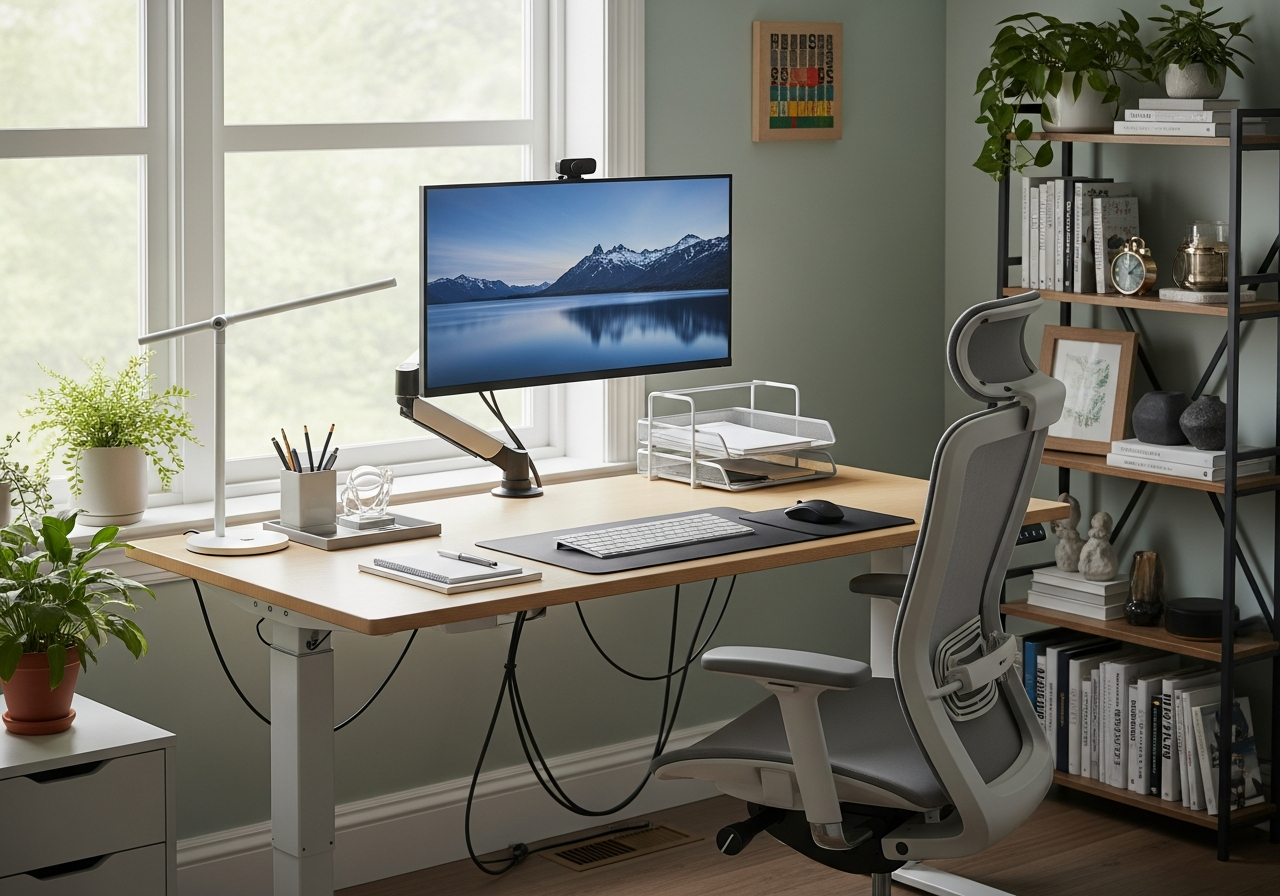 Desk height matters more than most people realize. When seated, your elbows should rest at a 90-degree angle with your forearms parallel to the floor. This typically means a desk height between 28 and 30 inches for most adults. Adjustable desks solve this problem entirely by letting you switch between sitting and standing throughout the day.