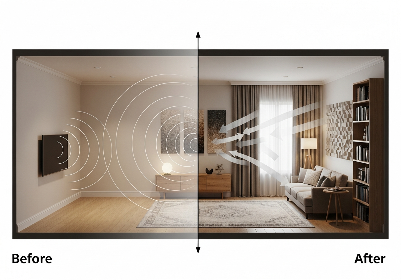 The technical term is reverberation. It happens when sound reflects off multiple surfaces before finally dying out. In a gym, that’s expected. In your living room, it’s annoying and makes conversation difficult.